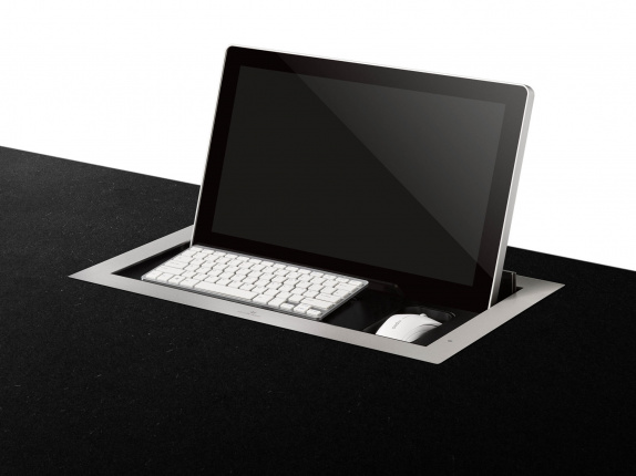 Монитор DynamicX2 в комплекте с клавиатурой и мышью, размещенных в моторизованной системе, которая поднимает клавиатуру и мышь при поднятии монитора. Экран Full HD с элегантной клавиатурой и мышью превращается в целую рабочую станцию одним нажатием кнопки.