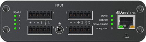 С помощью сетевого аудио интерфейса возможно преобразовать до четырех линейных / микрофонных аналоговых сигнала в сетевой сигнал Dante для легкой маршрутизации и подключения через браузер.