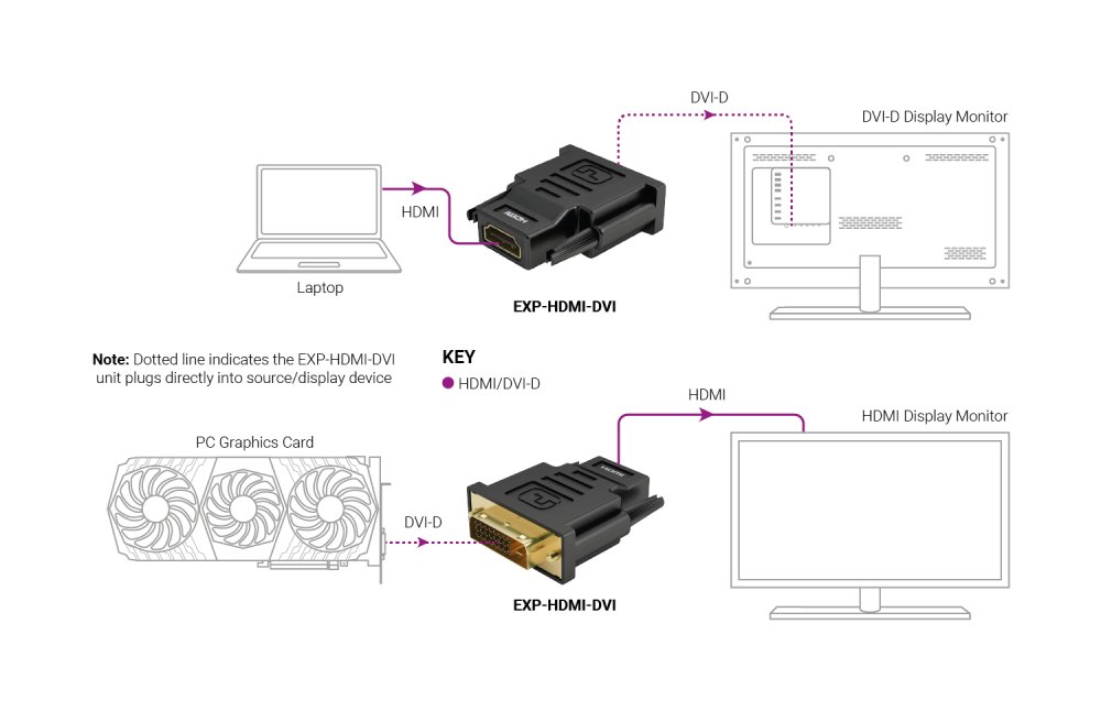 WyreStorm EXP-HDMI-DVI – это двусторонний адаптер, который может либо преобразовывать сигналы HDMI в сигналы DVI-D, либо сигналы DVI-D в сигналы HDMI, и совместим с различными источниками HDMI и дисплеями DVI.