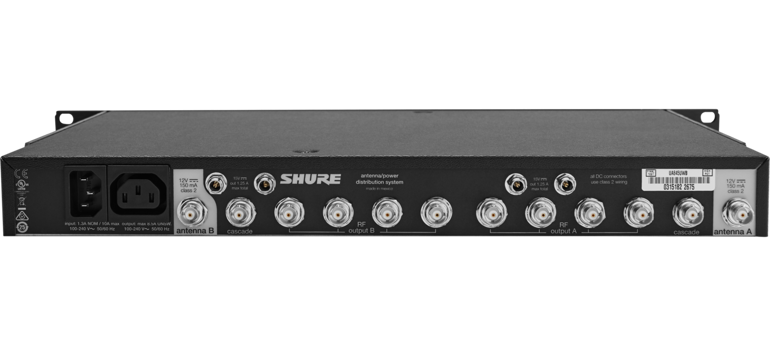 Антенный дистрибьютор c переключаемым частотным диапазоном Shure UA845UWB/LC-E имеет по 4 выхода для разделения сигнала с каждой антенны, каскадные порты, а также 4 порта для питания приёмников.