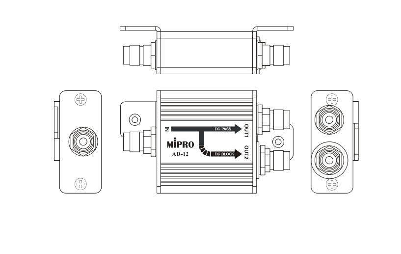 AD-12 адаптирует изолированную конструкцию заземления для устранения шума от источника питания при работе с несколькими приемниками. Он может либо разделить радиочастотный сигнал на 2 сигнальных выхода, либо объединить 2 входных сигнала в 1 выходной сигнал. Одновременно он пропускает биас-питание от внешних усилителей.
