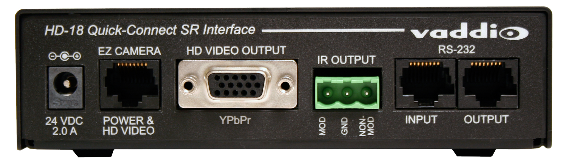 В камерах RoboSHOT используется система Vaddio EZCamera™ для транспортировки сигналов видео, питания и управления HSDS™ в/из камеры по кабелям CAT-5e. Интерфейсы Quick-Connect™ незамедлительно предоставят максимальную гибкость настройки. Модель RoboSHOT 12 QSR оснащена интерфейсом Quick-Connect SR, который позволяет без потерь передавать сигналы видео, питания и управления посредством двух кабелей Cat-5 на расстояние до 100" (30,5 метров). Доступен аналоговый компонентный видеовыход HD (YPbPr) с 1080p, 1080i или 720p.