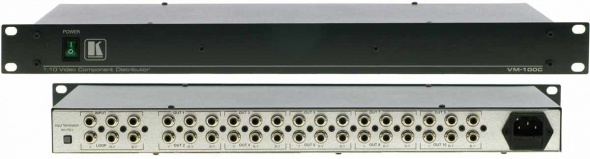 Kramer VM 100C — высококачественный усилитель-распределитель компонентного видеосигнала 1:10, совместимый с HDTV. Видеосигнал подается на один вход и распределяется на десять идентичных выходов с разъемами RCA. Благодаря ширине полосы пропускания 450 МГц усилитель-распределитель «прозрачен» для видеосигнала даже при самых высоких разрешениях. Для подключения локального монитора или другого приемника компонентноговидеосигнала, а также для построения систем с большим количеством выходов предусмотрены разъемы каскадирования. Регуляторы на нижней поверхности прибора позволяют регулировать уровни YUV и компенсировать АЧХ кабеля (EQ.) для каждого канала отдельно. VM-100C размещен в 19" 1U корпусе для установки в стойку и питается от сети переменного тока 100-264 В, 50/60 Гц.