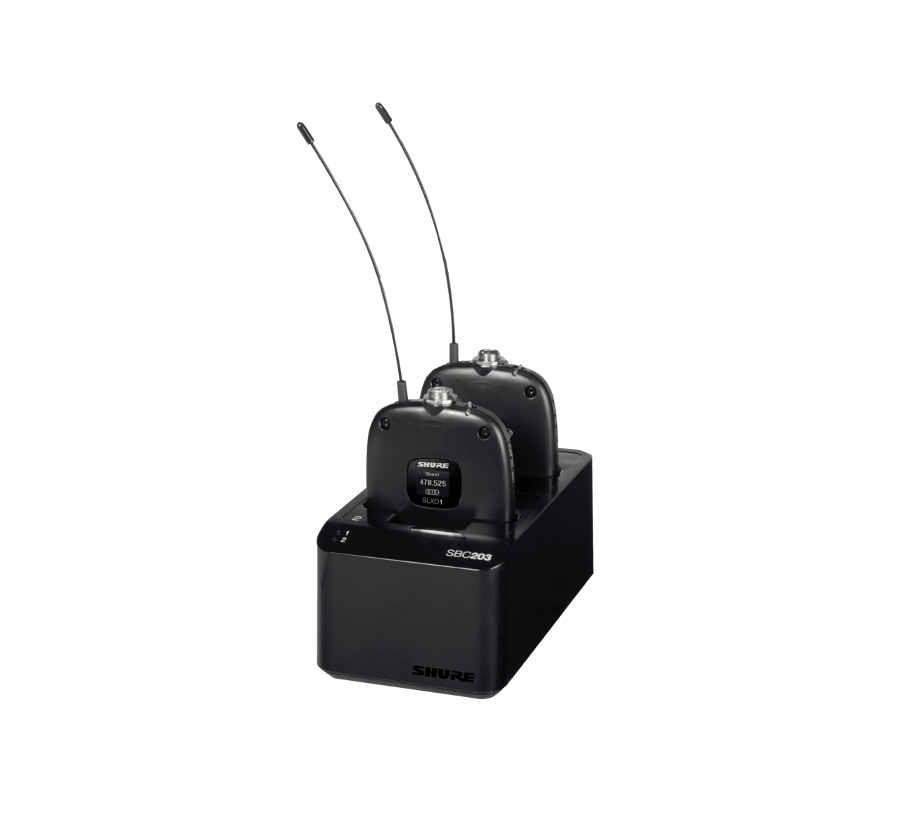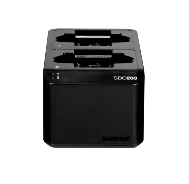 Shure SBC203 - двухпортовая зарядная док-станция для литий-ионных аккумуляторов SB903. Аккумулятор можно заряжать прямо в передатчике или отдельно.