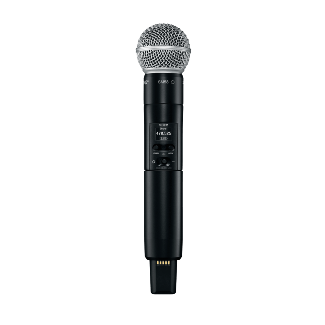 Ручной передатчик SHURE SLXD2/SM58 надёжный и простой в эксплуатации, с микрофонным капсюлем SM58, прекрасно подходящий как для проведения презентаций, так и для концертных выступлений.