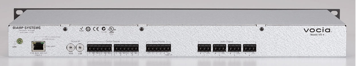 VO-4 — сетевой модуль аудиовыходов системы Biamp Vocia. VO-4 позволяет принимать 4 цифровых аудиоканала по протоколу CobraNet и передавать их на 4 аналоговых выхода линейного уровня. VO-4 оснащен DSP для локальной всесторонней обработки сигнала и памятью для хранения собственных настроек.