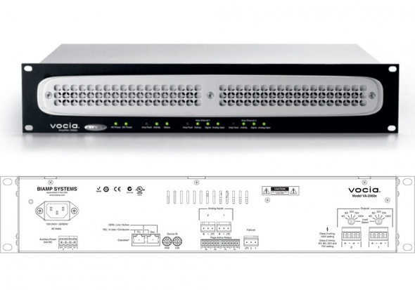 VA-2060e — цифровой сетевой двухканальный усилитель, работающий по протоколу CobraNet. Обеспечивает выходную мощность до 60 Вт RMS на каждый канал. Усилитель имеет аналоговые входы для подключения локальных источников звука, а также дополнительный разъем для подключения резервного питания 24 В. Поддерживает резервирование устройств или каналов на случай отказа.