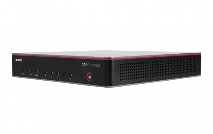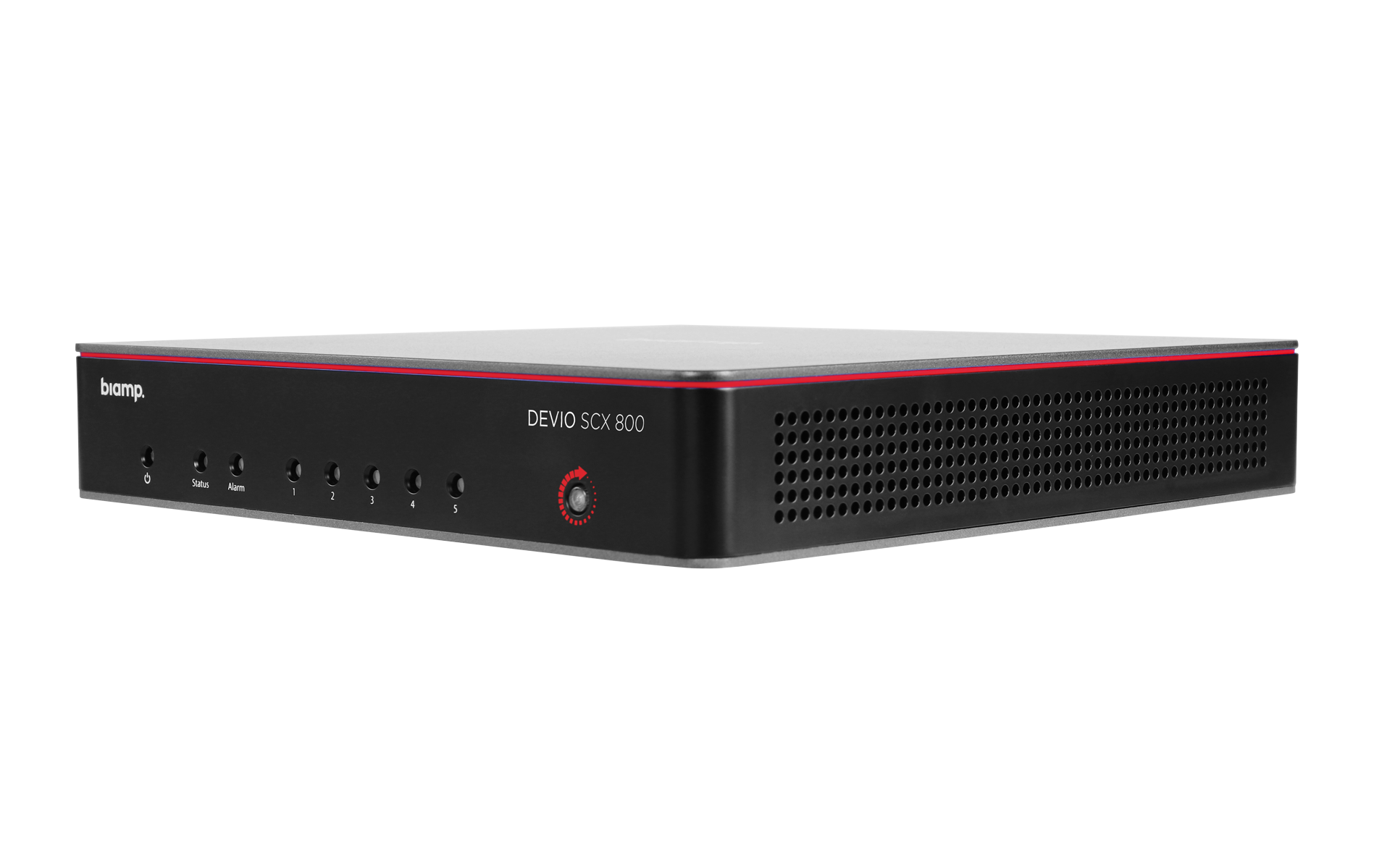 Devio SCX ™ 800 — хаб для конференц-залов и переговорных комнат, совместимый с устройствами компании Biamp. Хаб оснащен USB портом для подключения в качестве внешнего аудиоустройства к Biamp Modena или системам Unified Communications. Прибор оснащён интерфейсами SIP VoIP, подключаемыми через гигабитное Ethernet-соединение.