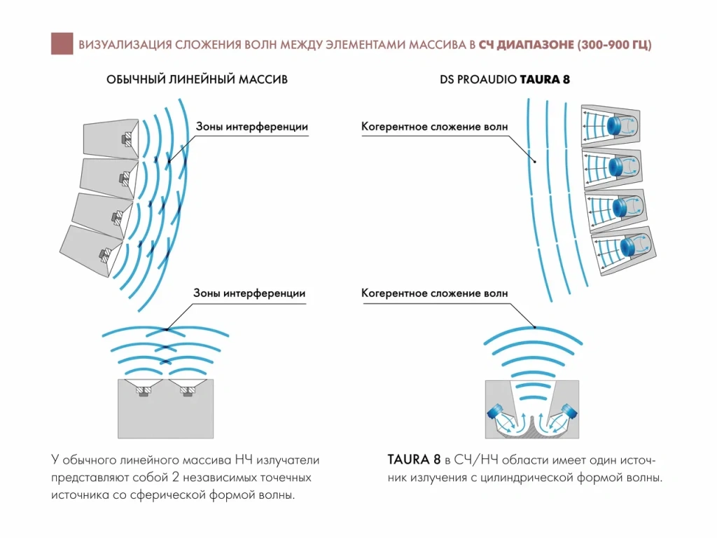 Особенность конструкции TAURA 8 заключается в том, что НЧ-секция (2 х 8”) так же нагружена на волновод, выполняющий дополнительно функцию рупора, что повышает КПД излучателей. Конструкция разработана таким образом, что вместо двух точечных источников в НЧ диапазоне мы имеем единый источник излучения с формой волны оптимальной как для сложения с ВЧ секцией, так и элементов массива между собой.