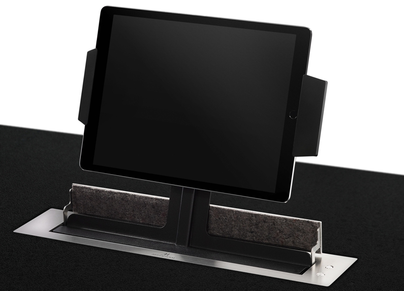 Моторизованная подъемная система обеспечивает возможность разместить планшет Apple IPad как в вертикальном, так и в горизонтальном положении для того, чтобы создать идеальный угол обзора, отклоняя монитор максимум 20 градусов.