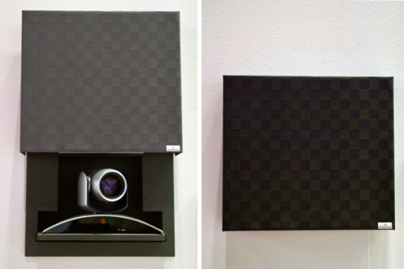 Профессиональный моторизированный корпус под видеоконференц-камеру и настенная система, способная скрывать оборудование видеоконференцсвязи, когда оно не используются, сохраняя при этом интерьер помещения.