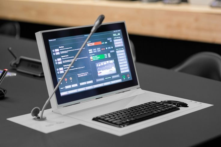 • Моторизованный профессиональный 17,3" Full HD монитор и подъемная система для микрофона, для интеграции в столы конференц-зала.