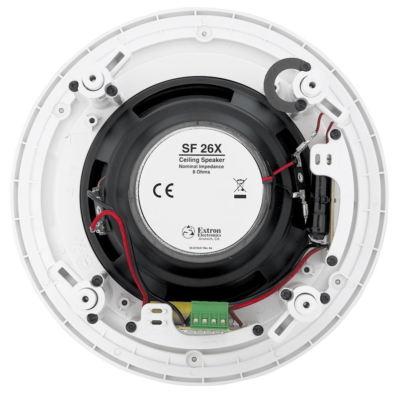 Модель SF 26X серии SoundField® от Extron представляет собой двухполосный потолочный громкоговоритель открытого типа с коаксиальным дизайном динамика для использования в «не пленум»-инсталляциях. Головка громкоговорителя включает в себя НЧ-динамик 6.5" (165 мм), соединённый с твитером купольной формы 3/4" (19 мм), охлаждаемым ферромагнитной жидкостью. Частотный диапазон SF 26X от 50 Гц до 20 кГц обеспечивает точное и детальное воспроизведение речи и музыки. Громкоговоритель имеет номинальный импеданс 8 Ом и характеризуется широкой зоной равномерного звукового покрытия с конической дисперсией 107°, а также неокрашенным частотным диапазоном, измеренным вне рабочей оси. SF 26X выпускается с тонкой рамкой для эстетичного размещения на потолке и защитной решёткой на магнитных держателях.