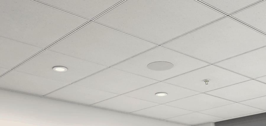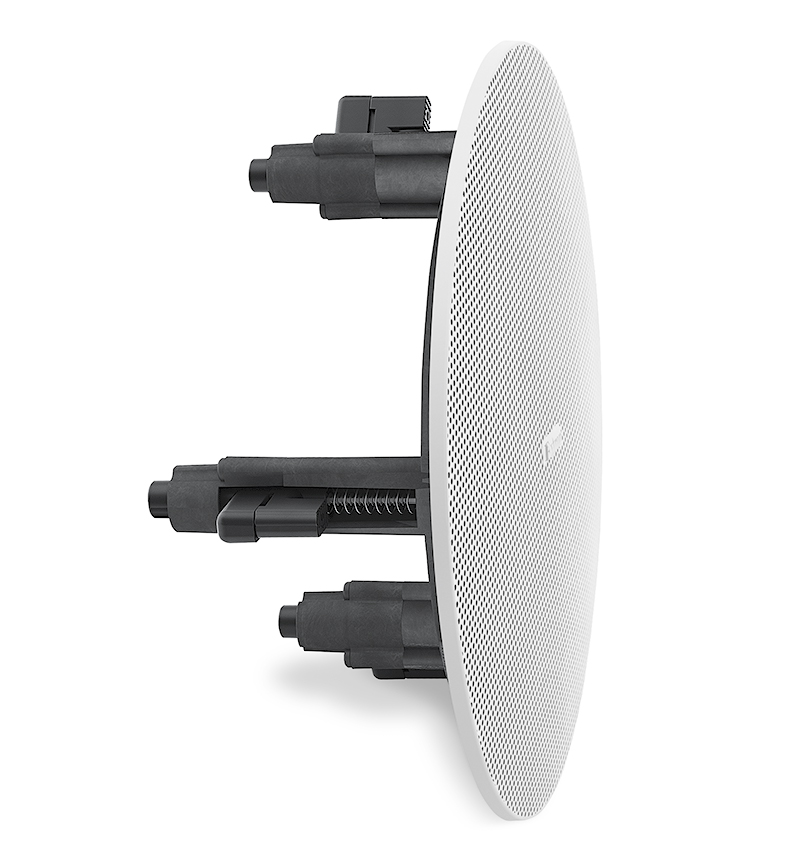 - Окрашиваемая решётка для потолочного громкоговорителя и C-образное кольцо «маскируют» выход сабвуфера под потолочный динамик Extron