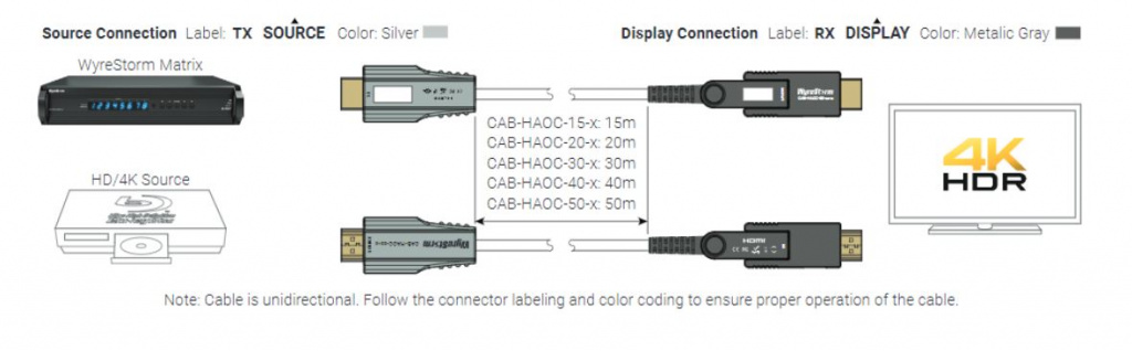 WyreStorm CAB-HAOC-20-C - активный оптический кабель HDMI нового поколения, предназначенный для 4K UHD следующего поколения с HDR-контентом. Кабель обеспечивает несжатый контент с пропускной способностью 24 Гбит / с HDMI до 20 м, используя новейшую технологию передачи, поддерживая дополнительные функции HDMI, такие как CEC и ARC. Отсоединяемый разъем HDMI типа A на приемной стороне позволяет легко установить его, уменьшив размер головки до 14 мм / 0,55 ”.