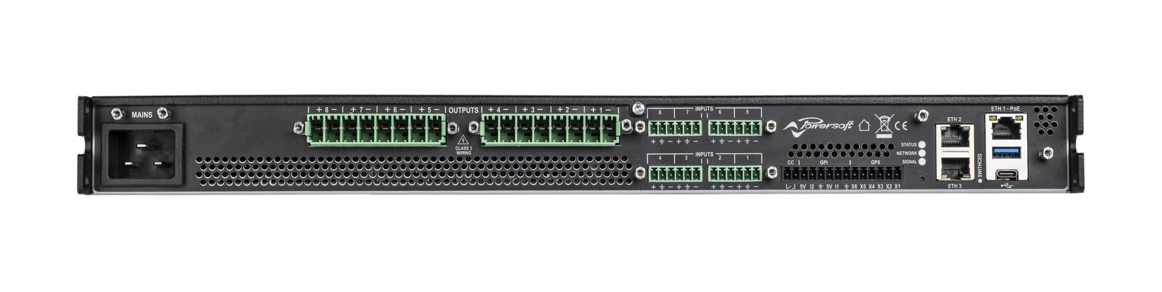 Платформа Unica включает DSP следующего поколения от Powersoft, обеспечивающий передовую обработку сигнала и высокое качество звучания. Три порта Gigabit Ethernet, а также поддержка нативного Dante и AES67 позволяют использовать различные сетевые топологии, включая последовательное соединение (daisy-chain) и резервирование Dante.