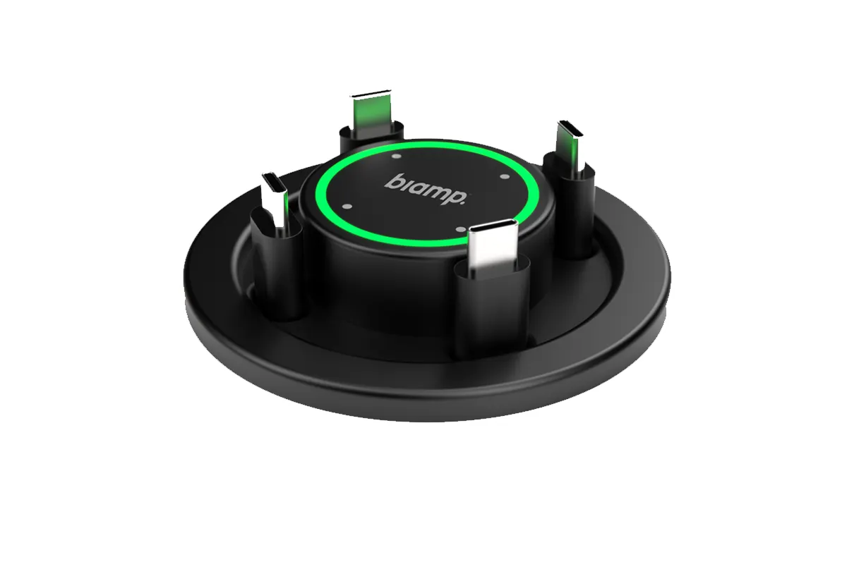 Просто подключите к своему устройству кабель USB‑C и нажмите кнопку, чтобы начать трансляцию контента и получить управление оборудованием в помещении, таким как камера, громкоговорители и микрофоны. Такое решение обеспечивает стабильное подключение, полностью заряженные ноутбуки и освобождённый от лишних предметов стол.