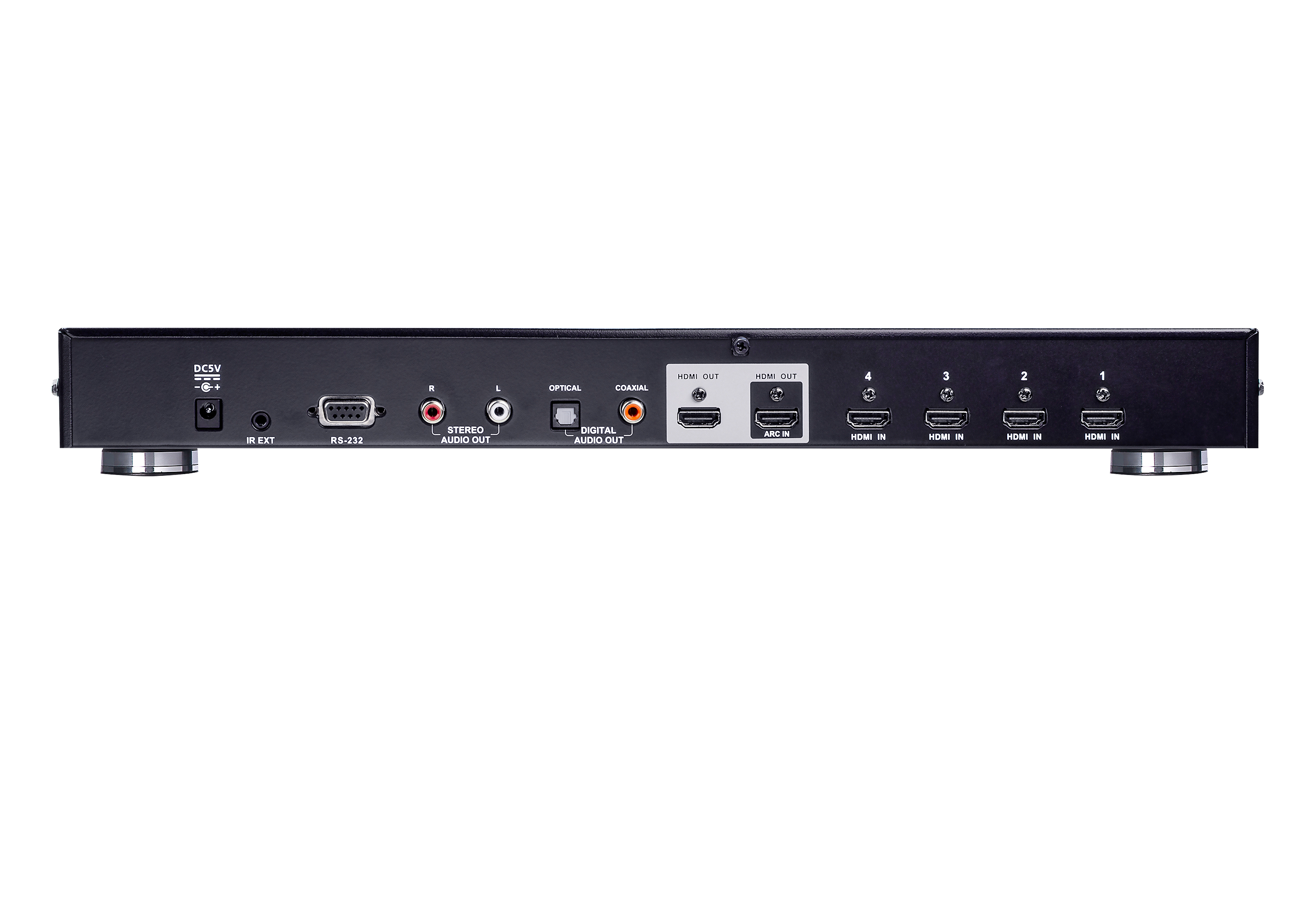 - Возможность переключение между источниками входного HDMI-сигнала с помощью кнопок на передней панели, ИК-пульта дистанционного управления и команд интерфейса RS-232