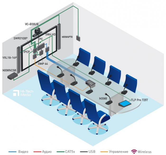 Пример конференц-зала средне-большого размера, предназначенного для совещаний, использующих беспроводную конференц-систему. Комплект включает в себя аппаратный кодек TE20, цифровую аудиоплатформу, тонкопрофильные звуковые колонны и полноценную система управления. Аудио тракт построен полностью на основе протокола Dante.