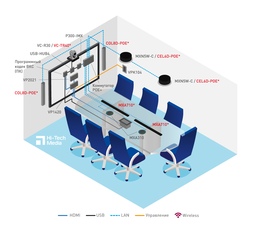Вся обработка звукового тракта происходит с помощью аудиопроцессора Shure P-300-IMX, улучшающего разборчивость речи и подавляющего сторонние шумы. Презентационная система Aten VP2021 позволяет делиться контентом с носимых устройств. А коммутатор Aten VP1420 осуществляет матричное переключение между источниками. Подключайте дополнительный монитор и управляйте системой не только с помощью кнопок на передней панели, ИК-пульта дистанционного управления, подключения по RS-232, но и с помощью внешнего кнопочного контроллера и веб-интерфейса через Ethernet. Предполагается интеграция демонстрационного ПК.