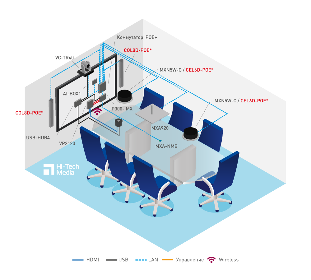 Smart-вариант переговорной комнаты с 8-ми канальным потолочным микрофонным массивом Shure MXA920 в круглом или квадратном форм-факторе. Его инновационная технология усиливает голос спикера, позволяя перемещаться по помещению в зоне охвата лучей (система ограниченного трекинга). А совместная работа с интеллектуальным процессором Lumens AI-BOX помогает реализовать систему наведения камеры Lumens на активного спикера в луче. Аудиопроцессор помогает в обработке сигнала, а также устранении эха и шумов (несколько вариантов шумоподавления).