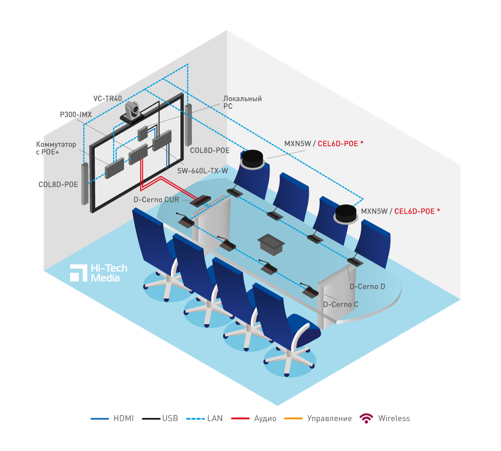 Для среднего/большого конференц-зала с прогр. кодеком, PTZ-камерой и цифровой дискуссионной системой Televic D-Cerno, надежной благодаря отказоустойчивому резервированию и сенсорным кнопкам пультов. Доступно подключение периферийных устройств и ПК по USB. Решение — на коммутации WyreStorm без дорогих матричных коммутаторов. Совместное использование экрана (BYOD).