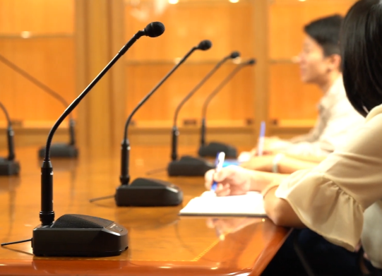 Предлагается проводная конференц‑система MIPRO на 16 рабочих мест на базе настольных пультов BC‑100 и микрофонов на гибкой шее MM‑205L.