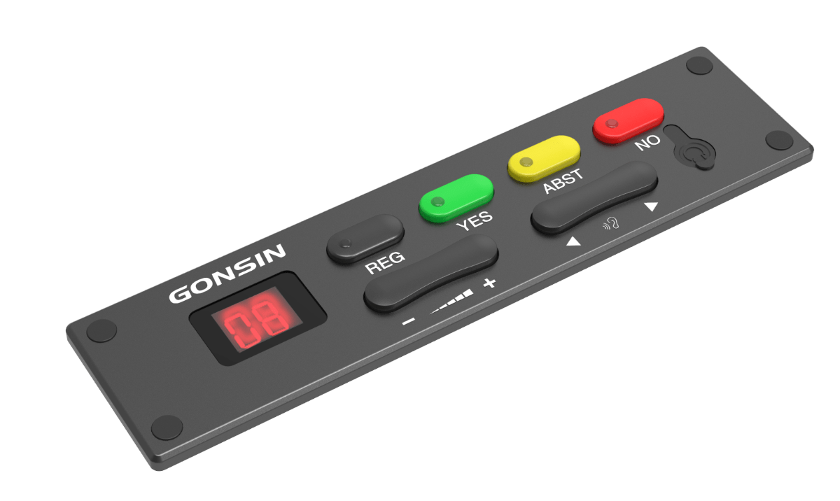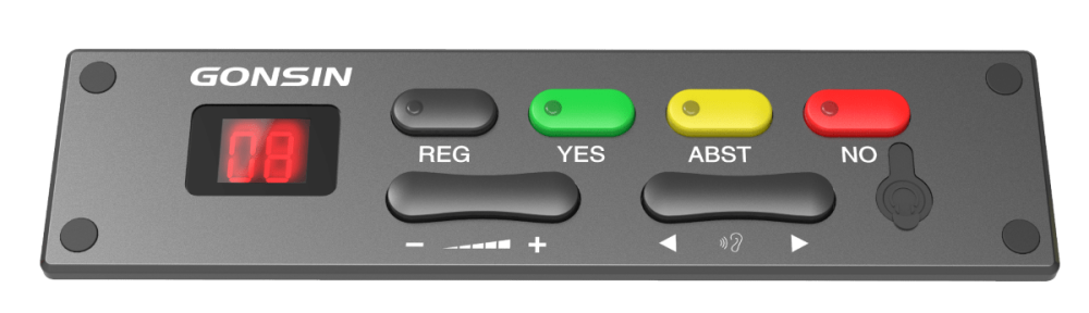 Врезная панель голосования и селектора каналов синхронного перевода Gonsin серии DCS-Q2057 предназначена для участия в совещаниях, голосованиях, многоязыковых конференциях, организованных на базе конференц-системы 10000N. Она выполнена в виде цельнометаллической панели привлекательного дизайна, подходящей для установки заподлицо. Врезная панель оснащена кнопками для участия в голосовании: кнопкой регистрации присутствия, тремя кнопками голосования со светодиодными индикаторами статуса. Панель имеет встроенный селектор канала синхронного перевода на 1+31 язык, который включает кнопку выбора канала, кнопку регулировки громкости, ЖК-дисплей и выход на наушники (3,5 мм jack). Панель подключается к центральному оборудованию системы 10000N через интерфейсный коммутационный модуль DCS-CON2057 или напрямую.