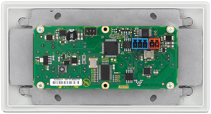 - Фронтальный монтаж с лёгким доступом — приёмопередатчик ИК, переключатели, кнопка сброса настроек и конфигурационный порт mini USB специально расположены за лёгкосъёмной настенной панелью на магнитных держателях.