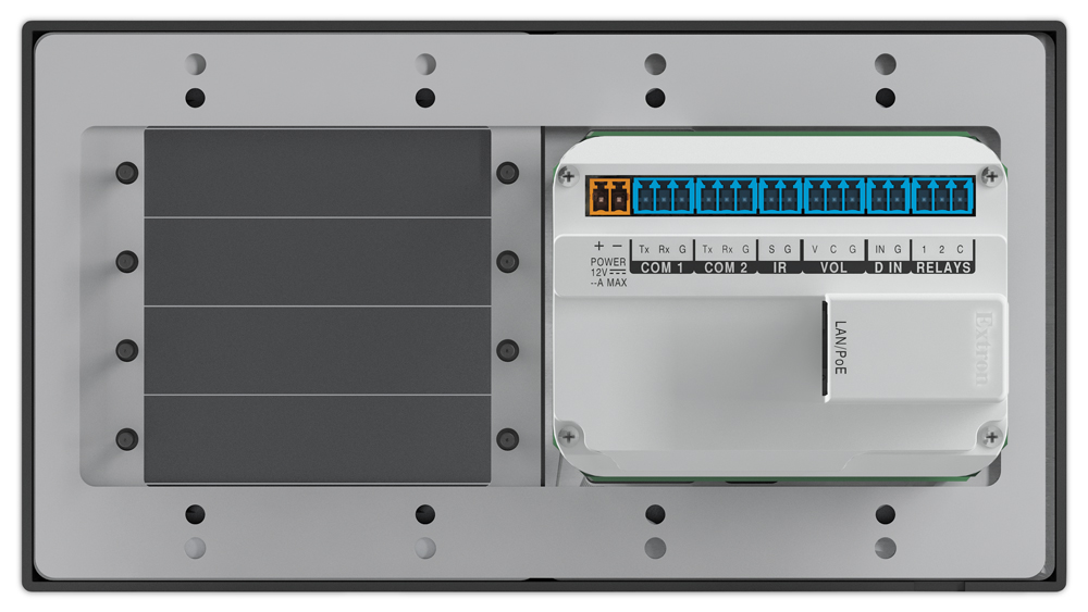 • Отверстие для четырёх одноместных архитектурных адаптерных панелей AAP — MLC 100 AAP вмещается в четырёхпозиционную настенную панель и имеет отверстие для установки до четырёх одноместных архитектурных адаптерных панелей AAP. Заполняющие планки для AAP в комплект не входят. Предлагаемое отверстие обеспечивает интеграцию со многими панелями Extron AAP, включая панель сквозного подключения.