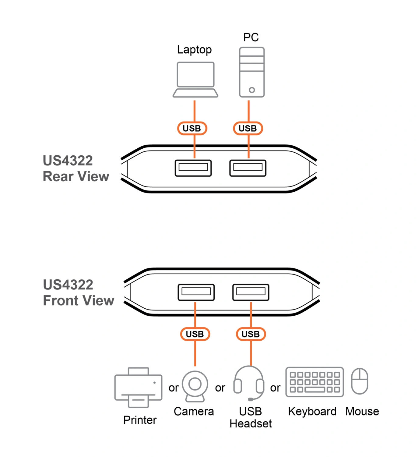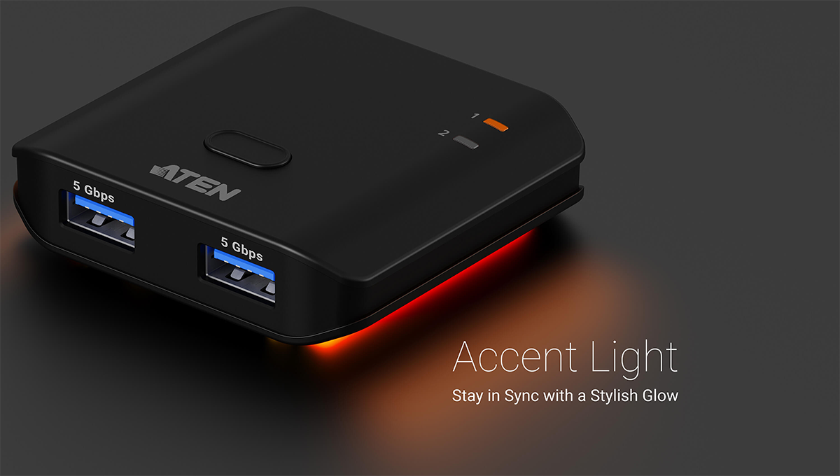 Переключатель ATEN US4322 одним нажатием кнопки позволяет совместно использовать 2 периферийных USB-устройства между двумя компьютерными системами со сверхвысокой скоростью 5 Гбит/с.