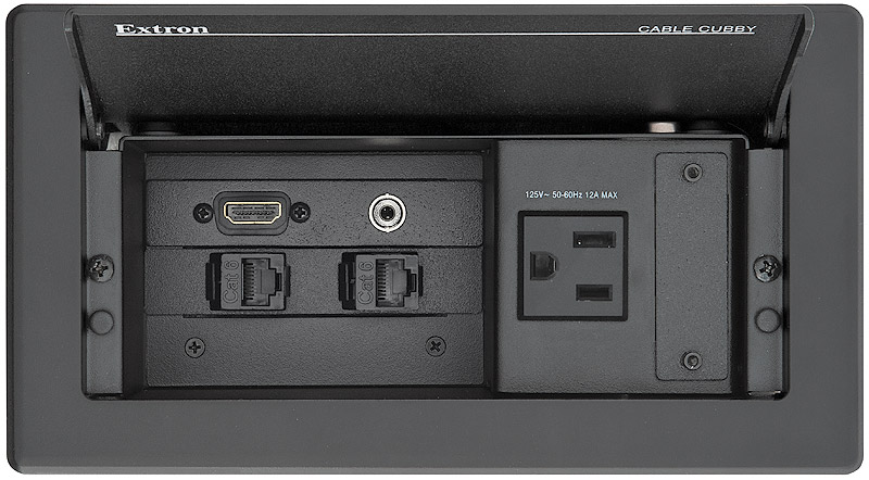 Extron Cable Cubby® 202 представляет собой компактный архитектурный лючок с одной встроенной неотключаемой электророзеткой и одной съёмной, сквозной опорой для четырёх AV-кабелей.