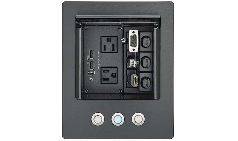 Лючок Cable Cubby 500 CCB оборудован кнопками для удобного управления коммутаторами и другими устройствами Extron с портами управления по «сухим» контактам. Три полированные кнопки из нержавеющей стали приподняты над поверхностью панели для удобства использования и тактильной обратной связи; для визуальной индикации каждая кнопка подсвечивается кольцом LED. Можно легко выбрать входы с помощью Cable Cubby 500 CCB без использования кнопок управления непосредственно на передней панели коммутатора. Доступна индивидуальная гравировка для удобства идентификации функций переключения.