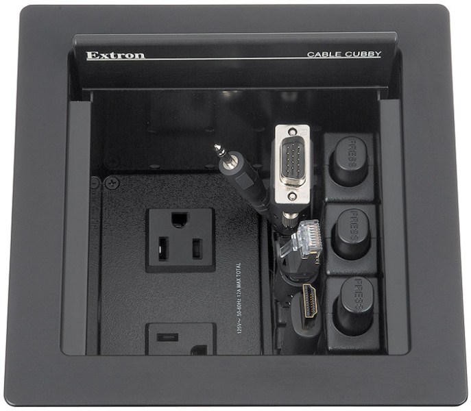 Cable Cubby® 500 – это модульный архитектурный лючок Extron с монтажом в мебель для подключений аудио, видео и питания. Лючок вмещает один блок питания AC или AC+USB и включает в комплект монтажные крепления для модулей сматывания кабелей Retractor, AV‑кабелей или архитектурных адаптерных панелей (АAP). Cable Cubby 500 CCB обеспечивает удалённый выбор входа на коммутаторах Extron с портами «сухих» контактов. Запатентованная модульная конструкция лючка позволяет устанавливать или обслуживать кабели и панели AAP через его верхнюю часть. Для оперативной установки Cable Cubby 500 оборудован интегрированной системой фиксаторов, которая быстро закрепляет лючок на поверхности мебели без использования дополнительных деталей или инструментов. Доступны блоки питания для США, Европы и других крупных рынков. Cable Cubby 500 выпускается в чёрном анодированном напылении или полированном алюминии.