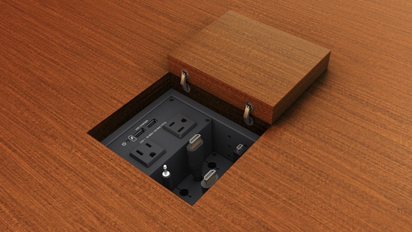 Cable Cubby® 650 UT – это модульный архитектурный лючок с монтажом под стол для подключения аудио- и видеосигналов, удалённого управления и передачи питания. Гибкая и открытая конструкция этого лючка обеспечивает простой доступ к кабелям при инсталляции в мебель класса «High-end» с профессионально изготовленной крышкой, подобранной к столу, которую предоставляет плотник. Лючки Cable Cubby 650 UT можно объединить вместе для создания практически бесконечных вариантов AV-подключений. В комплект лючка входят опоры для подключений с регулируемой высотой для монтажа трёх архитектурных адаптерных панелей (АAP) или восьми AV-кабелей и трёх модулей сматывания кабелей Extron линейки Retractor Series/2. Встроенные монтажные опоры подходят для столешниц любой толщины. Блоки питания линеек Series/2 AC и AC+USB, предлагаемые в качестве опции, доступны для США, Европы и других крупных рынков. Модель Cable Cubby 650 UT исполнена в чёрном напылении.