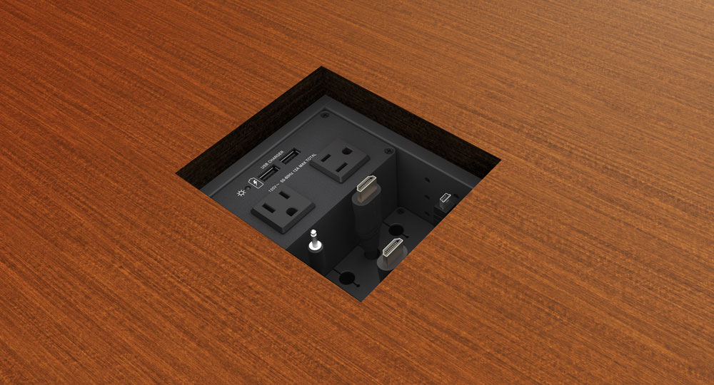 Модульная конструкция лючка позволяет устанавливать или обслуживать кабели и панели AAP через верхнюю часть лючка после его инсталляции. Сквозная панель для кабелей, входящая в комплект, имеет уникальный дизайн с круглыми отверстиями с прорезью, который упрощает проводку кабелей, устраняя необходимость в отдельных кольцах для кабелей. Опциональный комплект опор для кабелей Quad поддерживает по четыре кабеля для аудио и видео, что в общей сложности составляет восемь кабелей (продаются отдельно). Опциональный комплект опор для Retractor Triple вмещает три модуля сматывания кабелей; комплект опор для Retractor Double вмещает четыре модуля сматывания кабелей. Все опоры регулируются по высоте.