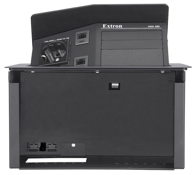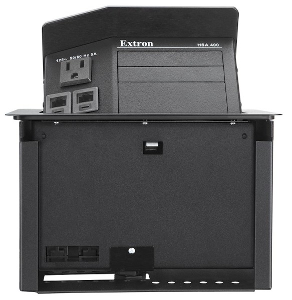 HSA 400 имеет одну розетку и два CAT 6 RJ-45 коннектора на передней панели для сети/телефона, в него можно установить до двух двойных панелей архитектурных интерфейсов (AAP) Extron. Розетки доступны в вариантах для США, Великобритании, Центральной Европы, Франции, Израиля и Индии. Кроме того, Hideaway HSA 400 может быть оптимизирован для использования с уникальным интерфейсным блоком Extron RGB 580xi.