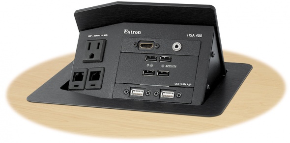Extron Hideaway® HSA 400 - архитектурное решение с открывающимся корпусом для незаметного доступа к интерфейсам компьютерного видео и управления. Лючок Hideaway HSA 400 разработан для легкой установки на поверхность практически любого стола с минимальными затратами времени и усилий.