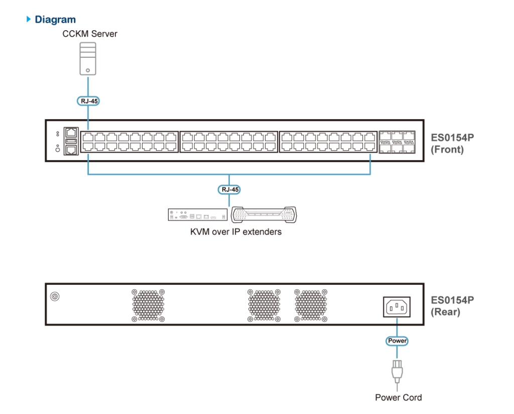 Коммутатор ES0154P оснащен 6 портами SFP28 (1G/10G/25G), 48 портами RJ-45 (10M/100M/1G) с PoE+ (поддержка 802.3at/af) и портами PoE++ (поддержка 802.3bt) (только порты 41–48). Функция Power over Ethernet (PoE) коммутатора ES0154P предоставляя значительную мощность в 740 Вт, распределенную по 48 портам RJ-45. Это устраняет необходимость во внешних адаптерах питания и приводит к существенному снижению затрат на конфигурацию электропитания.