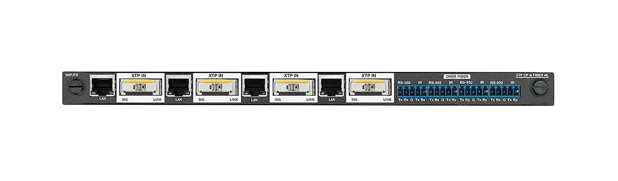 XTP CP 4i Fiber 4K представляет собой входную плату XTP, которая может принимать сигналы от четырёх удалённых источников. Она также имеет вставку Ethernet и четыре локальных порта для вставки двунаправленных сигналов RS‑232 и ИК, что позволяет одновременно управлять каждым из удалённых AV‑устройств.