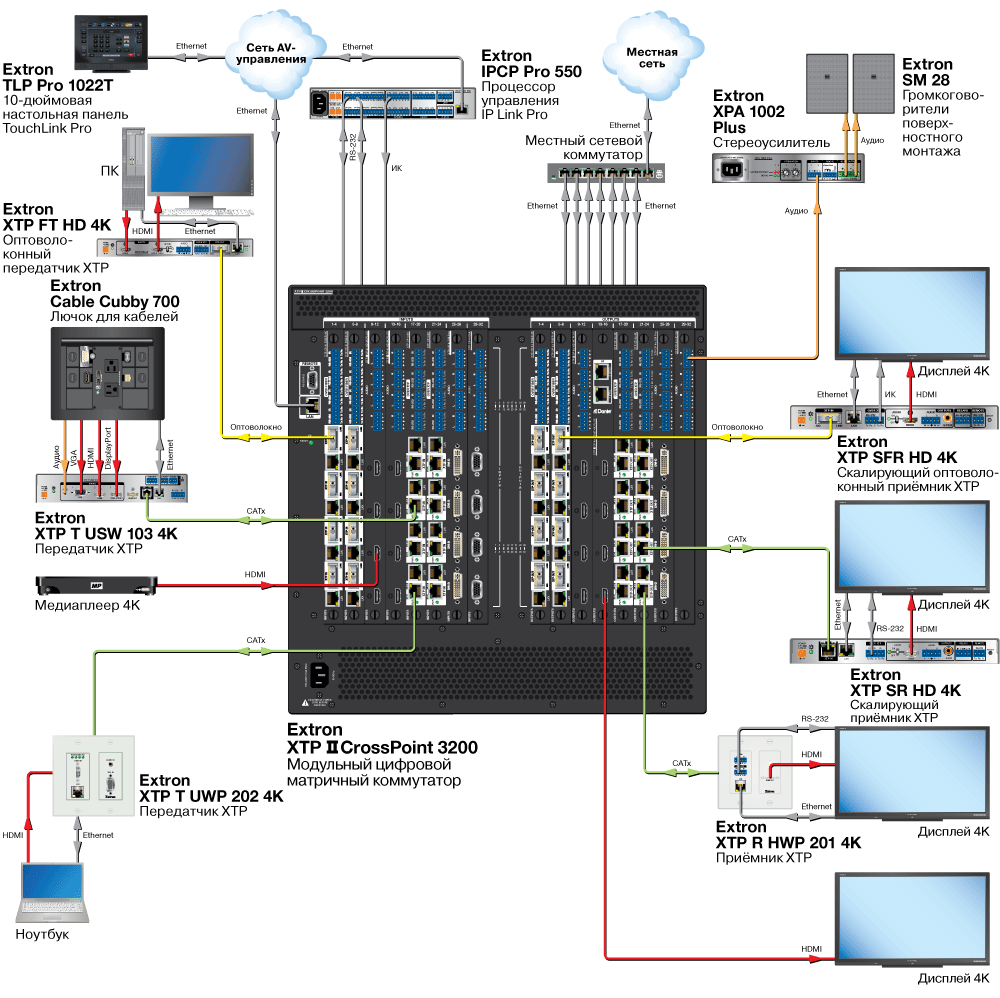 Линейка XTP Systems от Extron обеспечивает полностью интегрированное решение для коммутации и распределения сигналов различных цифровых и аналоговых форматов. Оборудование данной серии поддерживает локальное подключение, а также возможность удалённой передачи видео высокого разрешения, аудио, RS-232 и Ethernet на расстояние до 100 м по одному экранированному кабелю CATx и на ещё большее расстояние по оптоволокну. Каждая система совместима с HDCP и обеспечивает сверхбыструю, высоконадёжную коммутацию цифровых сигналов при помощи технологии SpeedSwitch® от Extron.