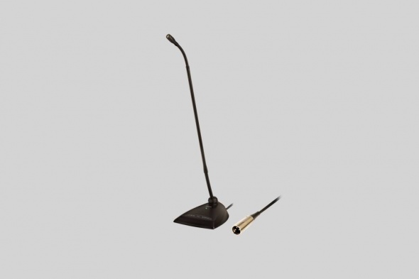 Настольный конденсаторный микрофон на 18-дюймовом гибком штативе со сменными картриджами, пенопластовым ветрозащитным экраном и фланцевым фиксатором. Обладает высокой чувствительностью и максимальной устойчивостью к появлению электромагнитного шумового фона и радиопомех.