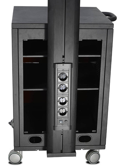 - M7761 (7350022737761) - Мобильная стойка для ЖК-панели 40-60", VESA 800x400, -5°+15°, до 60кг, портретная/альбомная, с закрытой стойкой под оборудование (три полки), 4xSchuko, алюминий, черный