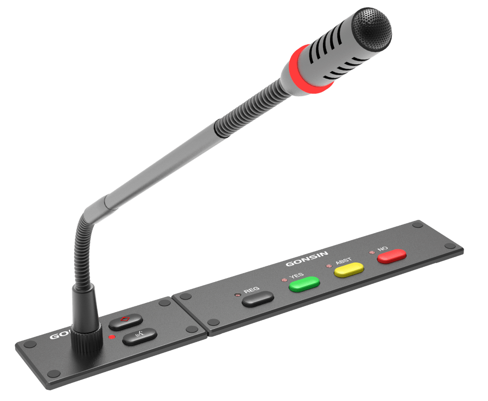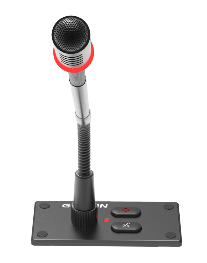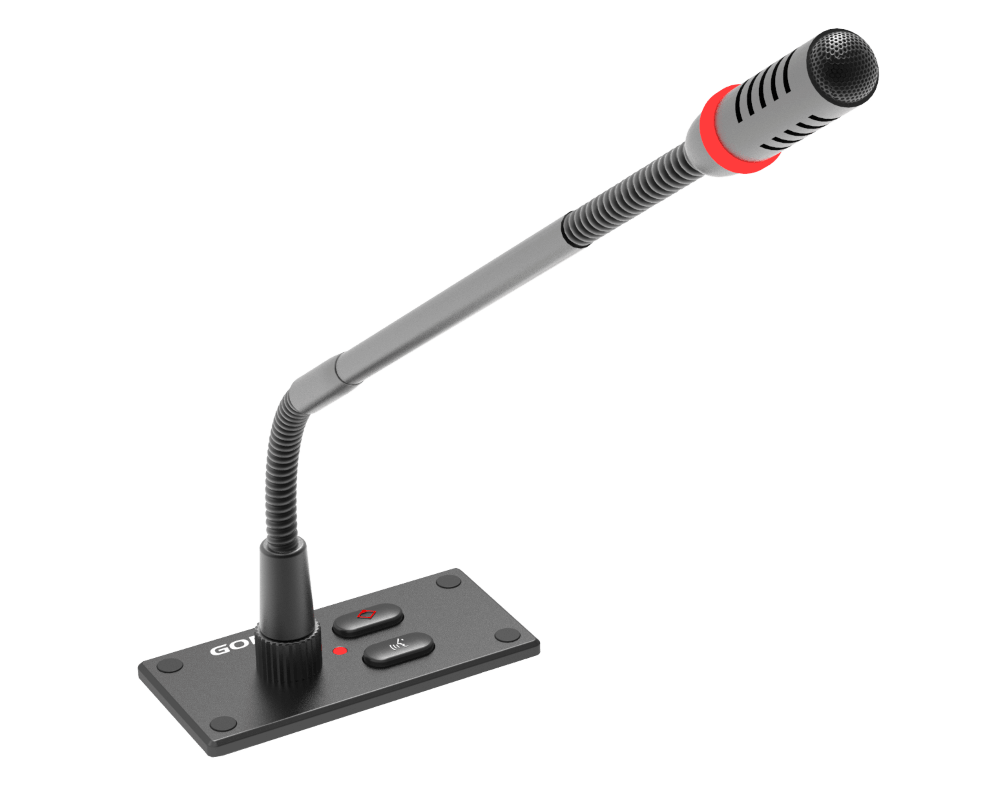 - Микрофон на гусиной шее: к дискуссионному модулю подключается съёмный микрофон на гибкой подставке типа «гусиная шея», который может быть отсоединен, когда модуль не используется, что делает его удобным для обслуживания оборудования. Электретный микрофон с кардиоидной характеристикой направленности имеет светодиодное индикаторное кольцо и подставку с двумя гибкими участками. В стандартную комплектацию включен микрофон длиной 410 мм, дополнительно можно заказать микрофон с гусиной шеей длиной 310 мм или 510 мм.