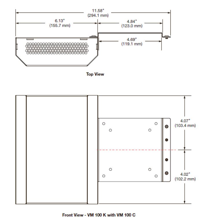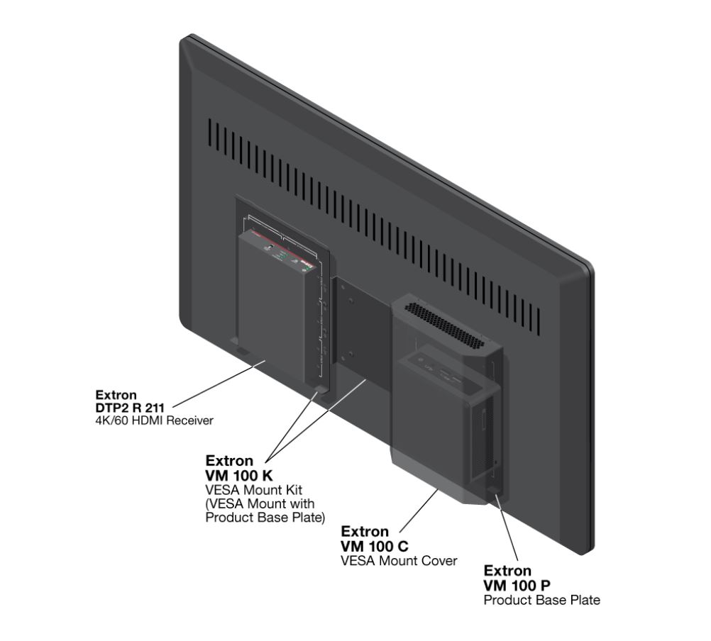 Монтажный комплект VM 100 стандарта VESA предназначен для закрепления устройства Extron на задней панели дисплеев. VM 100 включает в себя монтажную панель для дисплея и базовую панель для устройств, совместимую с монтажными шаблонами VESA 75 мм и 100 мм. Система крепления может быть расширена за счёт дополнительных базовых панелей, которые продаются отдельно. Монтажный комплект VM 100 не только упрощает интеграцию, но и позволяет надёжно и незаметно установить устройства, такие как приёмник, усилитель, небольшой ПК или блок питания на задней панели плоского дисплея за считанные минуты. Удобное размещение устройств позади дисплея