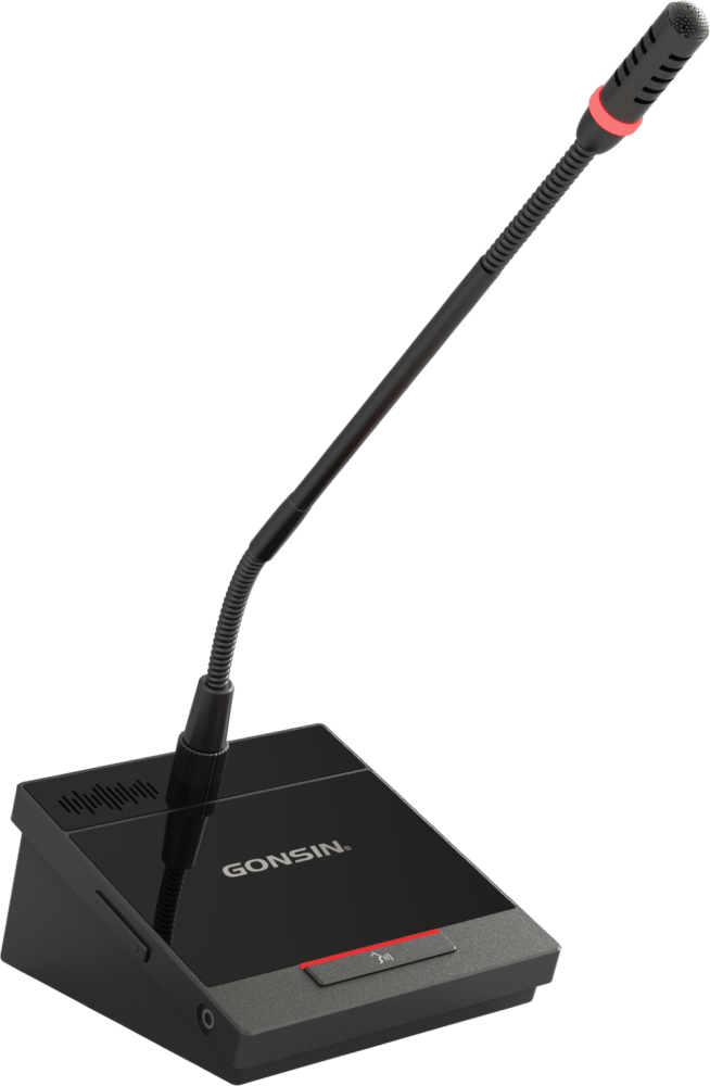Gonsin DCS-2044D-G — настольный проводной дискуссионный пульт делегата серии DCS-2044 предназначен для участия в совещаниях, организованных на базе конференц-системы 10000N. Пульт выполнен в металлическом корпусе и идет в комплекте со съёмным кардиоидным микрофоном на гусиной шее 410 мм со светодиодным индикатором и ветрозащитой. Пульт имеет встроенный громкоговоритель мощностью 2 Вт, регулятор громкости и выход для подключения наушников (3,5 мм jack).