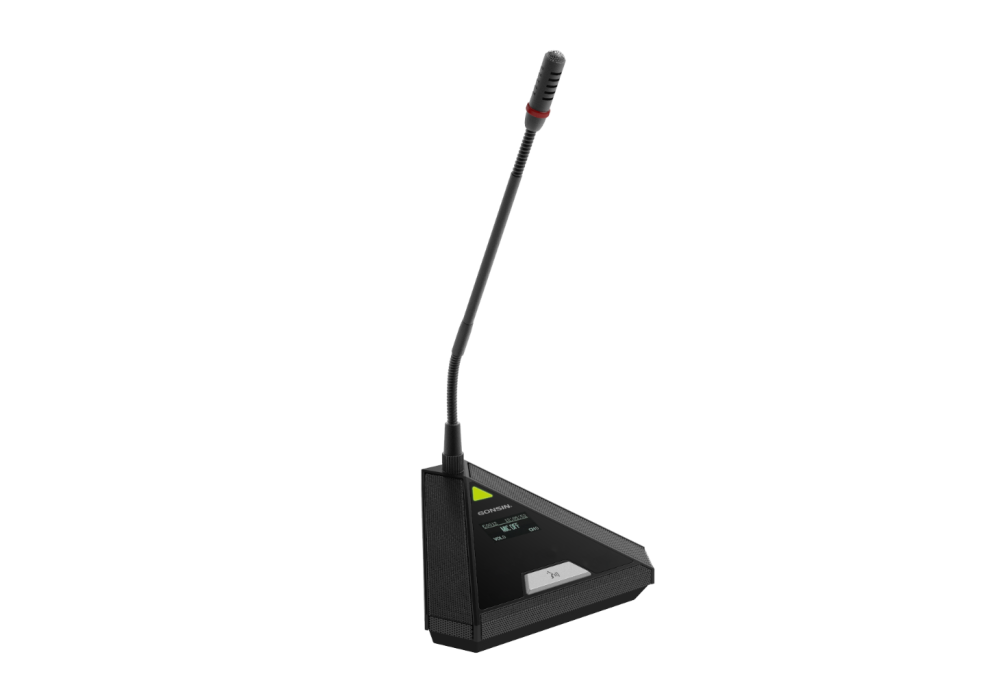 Gonsin DCS-2043D-G — настольный проводной дискуссионный пульт делегата серии DCS-2043 предназначен для участия в совещаниях, организованных на базе конференц-системы 10000N. Пульт выполнен в металлическом треугольном корпусе стильного дизайна и идет в комплекте со съёмным кардиоидным микрофоном на гусиной шее 410 мм со светодиодным индикатором и ветрозащитой.