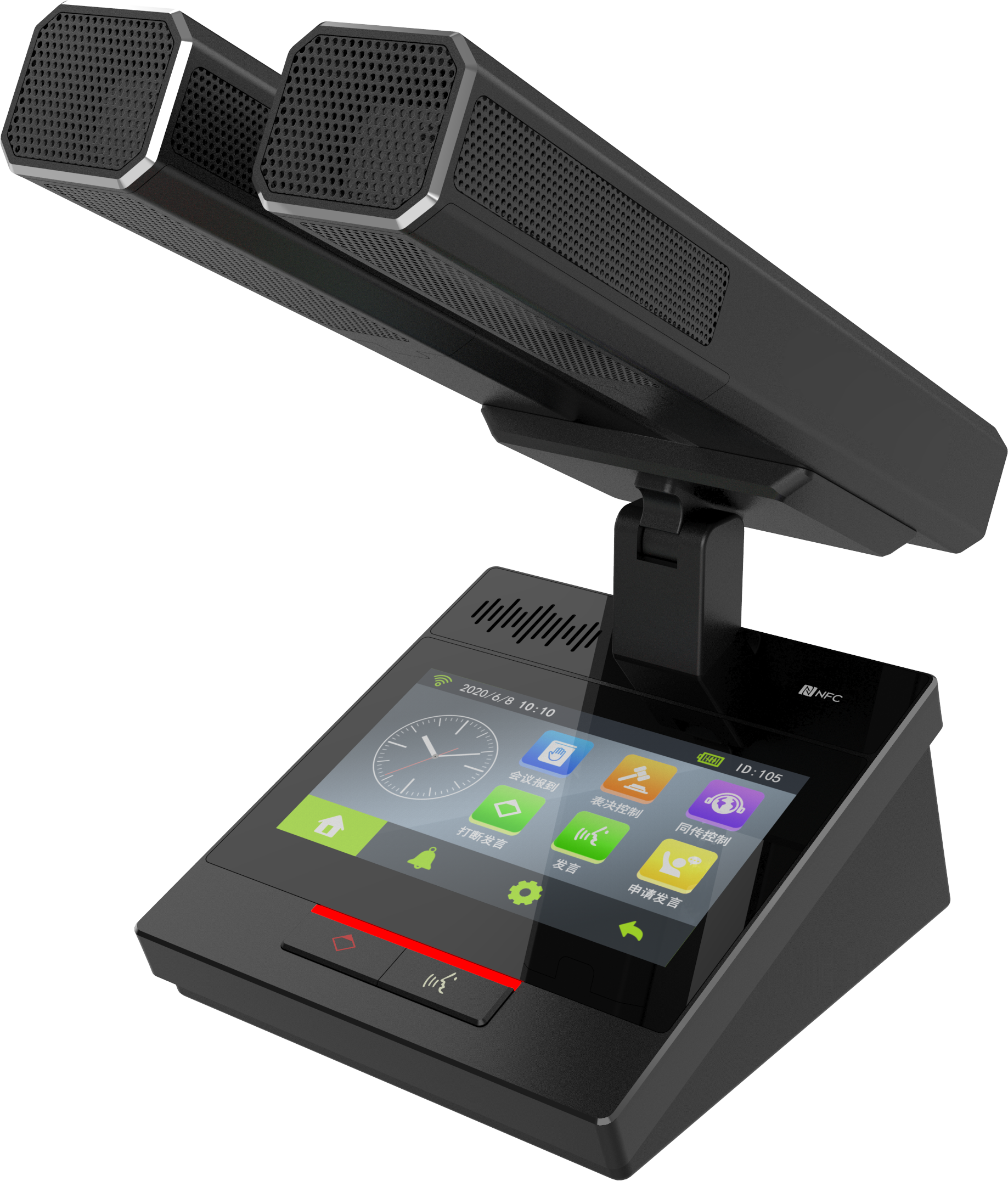 - 4,3-дюймовый сенсорный экран пульта отображает информацию о времени, статусе микрофона, сетевых настройках. Язык меню поддерживается китайский/английский (русский по запросу); в меню устанавливается контрастность, громкость, язык и другие функции пульта.