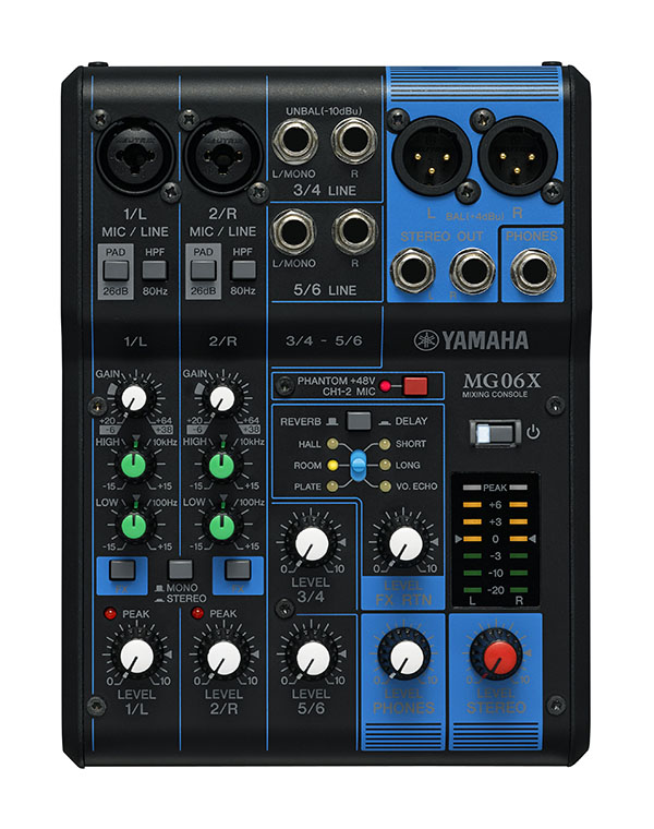 Аналоговый 6-канальный микшерный пульт. 2 микрофонных/линейных входа (моно) + 2 линейных входа (стерео). 1 стерео шина. 6 программ встроенного процессора эффектов