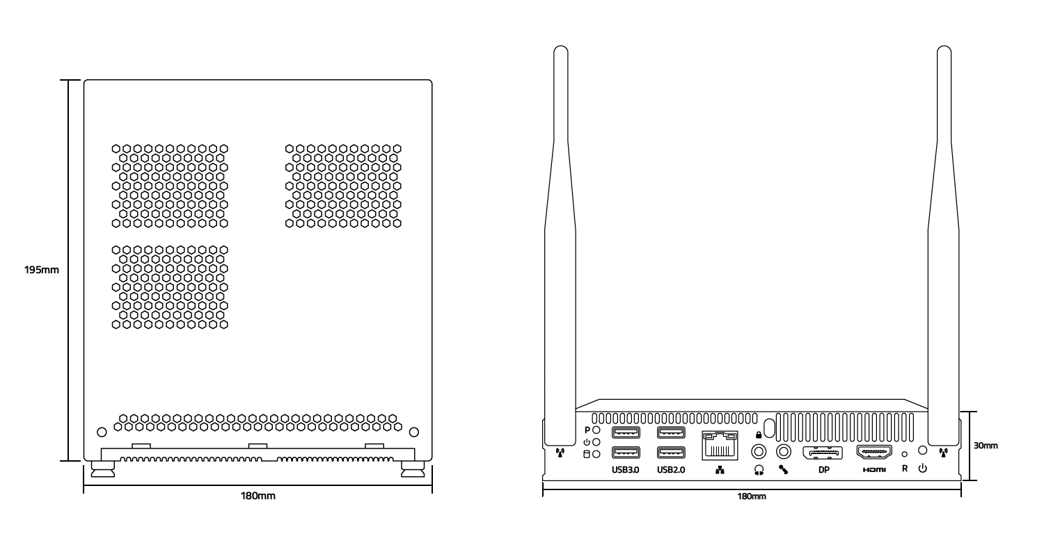 | Интерфейсы | LAN: Integrated 10/100/1000M Adaption WiFi: WiFi5 11ac Bluetooth: Bluetooth 4.2 USB3.0 x 2 USB 2.0 x 2 HDMI Out x 1 DP Out x 1 Mic In x 1 |